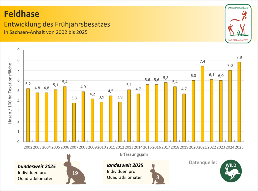 Sachsen-Anhalt hinkt allerdings weiter dem Bundesdurchschnitt hinterher. Bundesweit konnte 2025 erneut der Rekordwert vom letzten Jahr gehalten werden. Im Schnitt leben auch in diesem Jahr 19 Feldhasen pro Quadratkilometer auf der Fläche.