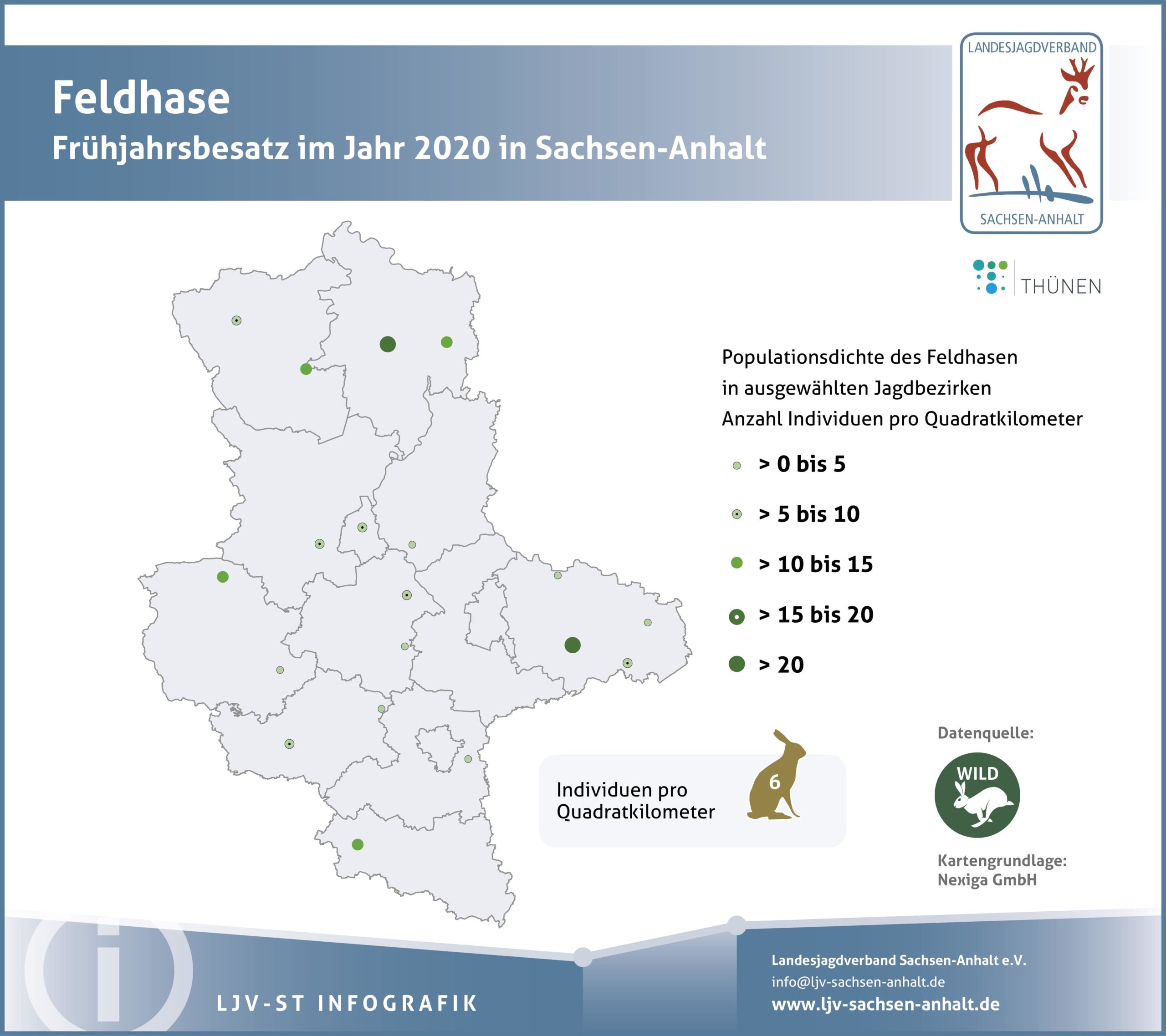Die Frühjahrszählung der Feldhasen im Jahr 2020 ergab, dass in Sachsen-Anhalt durchschnittlich 6 Hasen pro Quadratkilometer vorkommen. „Ein absoluter Rekordwert, wenn man die Zählergebnisse unseres Wildtiermonitorings seit 2001 betrachtet“, freut sich der Geschäftsführer des Landesjagdverbandes Sachsen-Anhalt, Wilko Florstedt. Wir hatten trotz eines geringen Frühjahrsbesatzes 2019 gute Zuwachsraten im Jahresverlauf bei den Feldhasen registrieren können. Ursächlich dafür waren die überdurchschnittlich warmen Temperaturen und die geringen Niederschläge, welche den Vermehrungszeitraum der Langohren verlängerten. Durch das milde Wetter im Jahresverlauf kam es zu einer geringen Sterblichkeit, insbesondere bei den Junghasen. Die im Jahr 2020 ebenfalls gute Nettozuwachsrate (+8 %) lässt auf eine weitere Stabilisierung der Feldhasenbesätze auch in diesem Jahr hoffen, so Florstedt weiter.