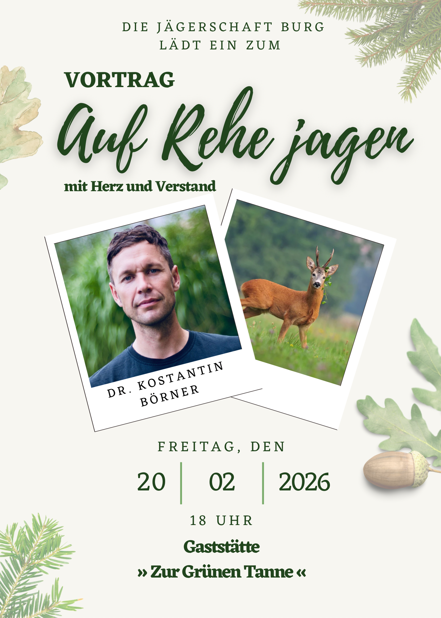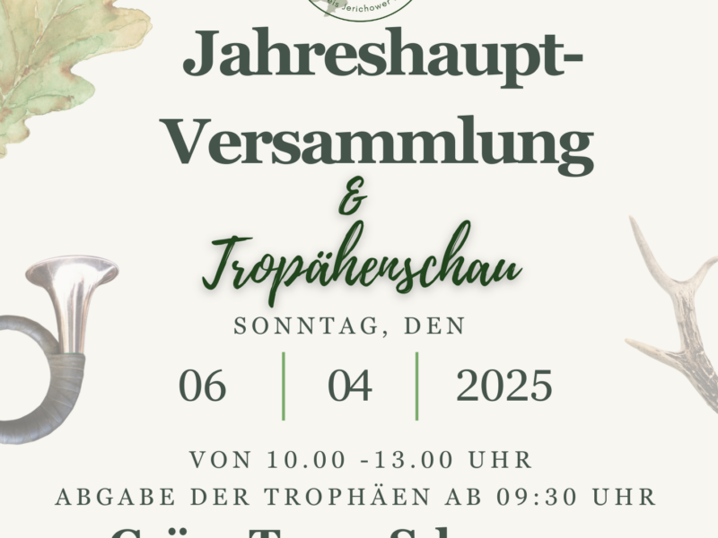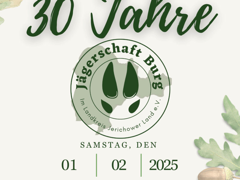 Liebe Mitglieder, wir laden euch herzlich zur Jahreshauptversammlung der Jägerschaft Burg im Landkreis Jerichower Land e.V. ein. Datum: Sonntag, 06. April 2025 Uhrzeit: 10:00 Uhr bis ca. 13:00 Uhr Ort: Gaststätte „Zur Grünen Tanne“ Adresse: Chausseestraße 14, 39291 Schermen Tagesordnung: Begrüßung und Totenehrung durch den Vorsitzenden Grußworte des Landrats […]