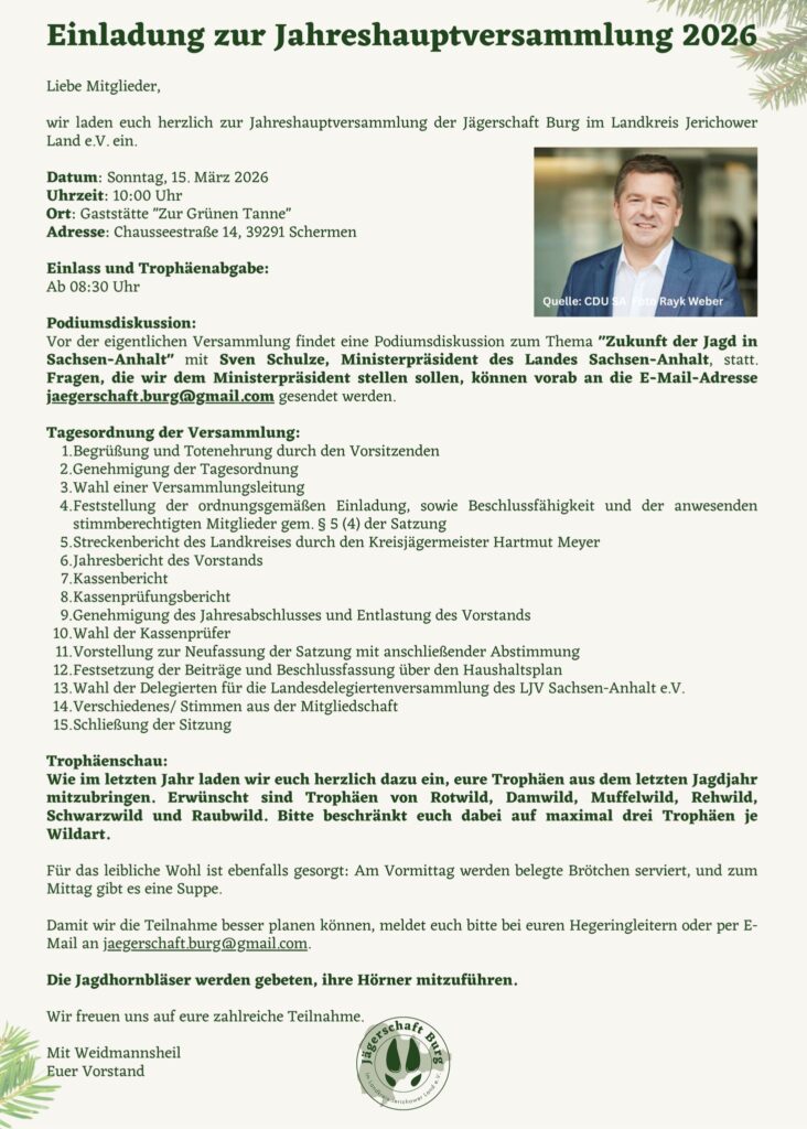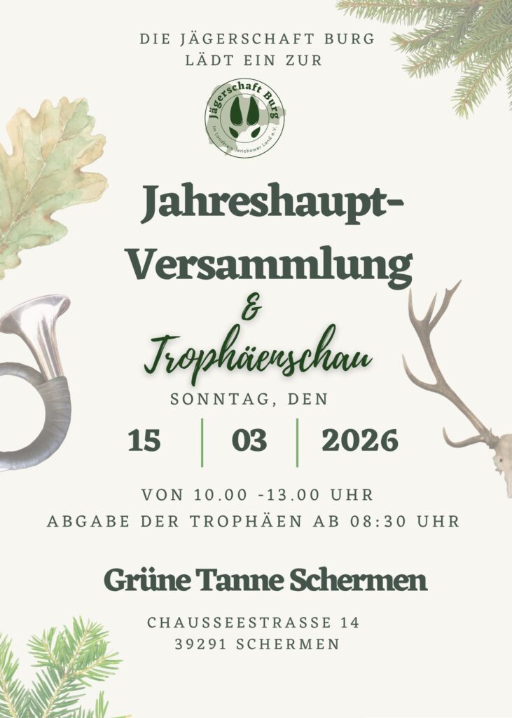 wir laden euch herzlich zur Jahreshauptversammlung 2026 der Jägerschaft Burg im Landkreis Jerichower Land e. V. ein.