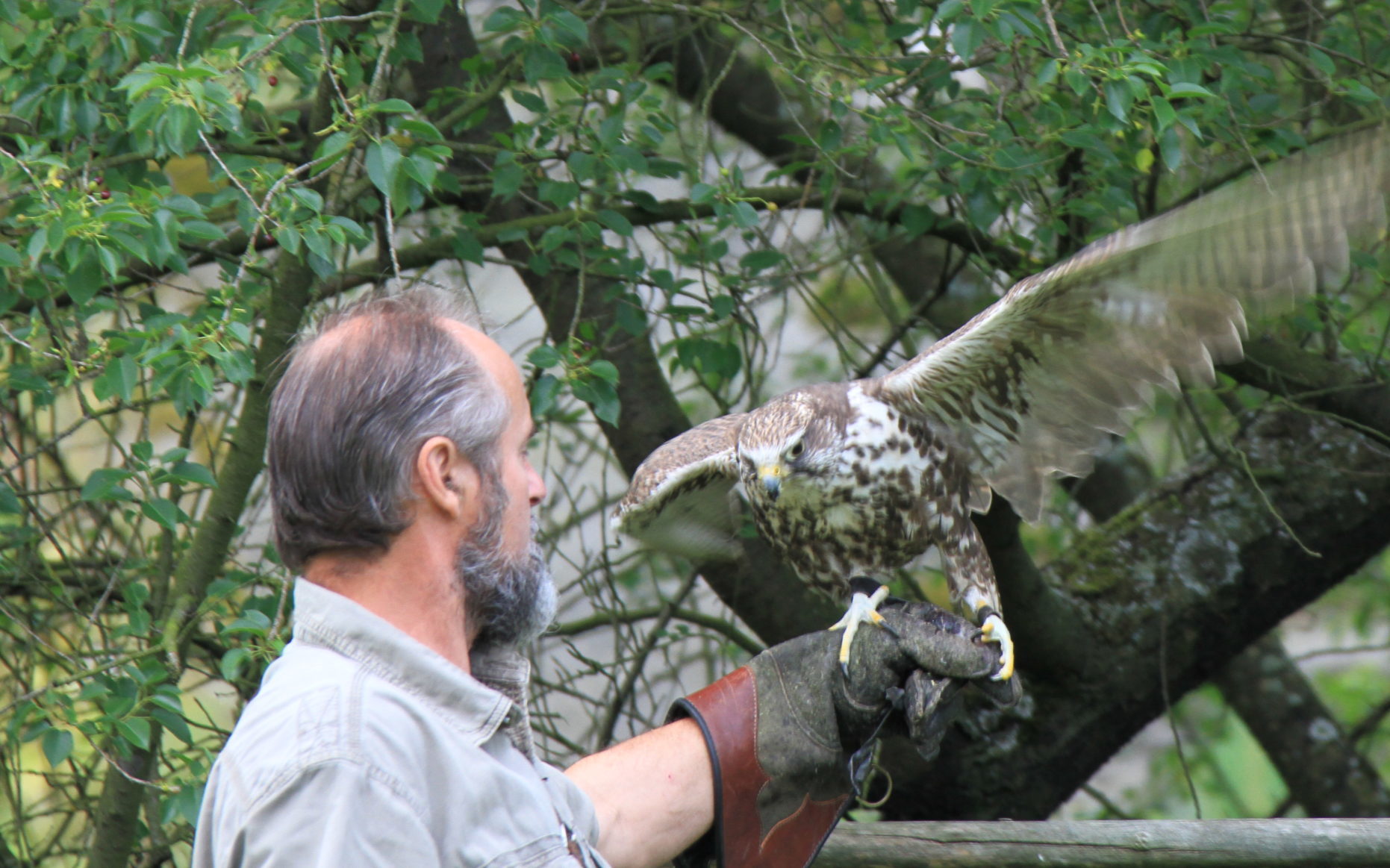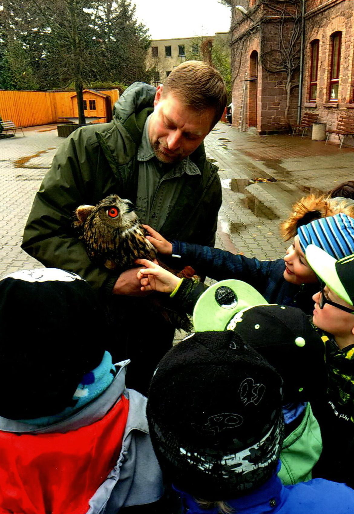 Jahre harter Arbeit liegen den Angeboten zugrunde. Wobei Wolfgang Mursa die Falknerei nicht in die Wiege gelegt wurde, sondern Schlüsselerlebnisse in seiner Kindheit und Jugend dafür ausschlaggebend waren, dass die Liebe zu den Greifvögeln und Eulen geweckt wurde. Als Ältester unter den fünf Geschwistern waren die ersten Lebensjahre geprägt von Bescheidenheit und eingebunden in eine Leidenschaft – dem Lesen. „Das war meine Welt – mit der Taschenlampe unter der Bettdecke eintauchend in die Welt der Sagen und gefesselt von geschichtlichen Werken“, erinnert sich Wolfgang Mursa. So gab es ein Sagenbuch, in dem ein Adler sich ein Kleinkind griff, um seine Jungen zu füttern. „Kann das überhaupt sein?“, fragte sich der Güntersbergener damals. Spätestens nachdem er den Klassiker der Falknereibücher, das „De arte venandi cum avibus“, eine der berühmtesten Handschriften des Mittelalters und vom Stauferkaiser Friedrich II. selbst verfasste Meisterwerk zur Falknerei mehrfach „verschlungen“ hatte, war ihm klar, dass die Sage kein Hirngespinst ist. „Meine Neugier war geweckt und ist bis heute nicht gestillt“, so der Falkner, der dann zunächst Jäger wurde und zu DDR-Zeiten auch Falkner wurde. Die waren damals beim Kulturbund angesiedelt und waren mehr oder weniger unter sich. (2019)