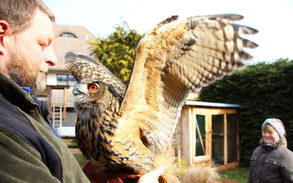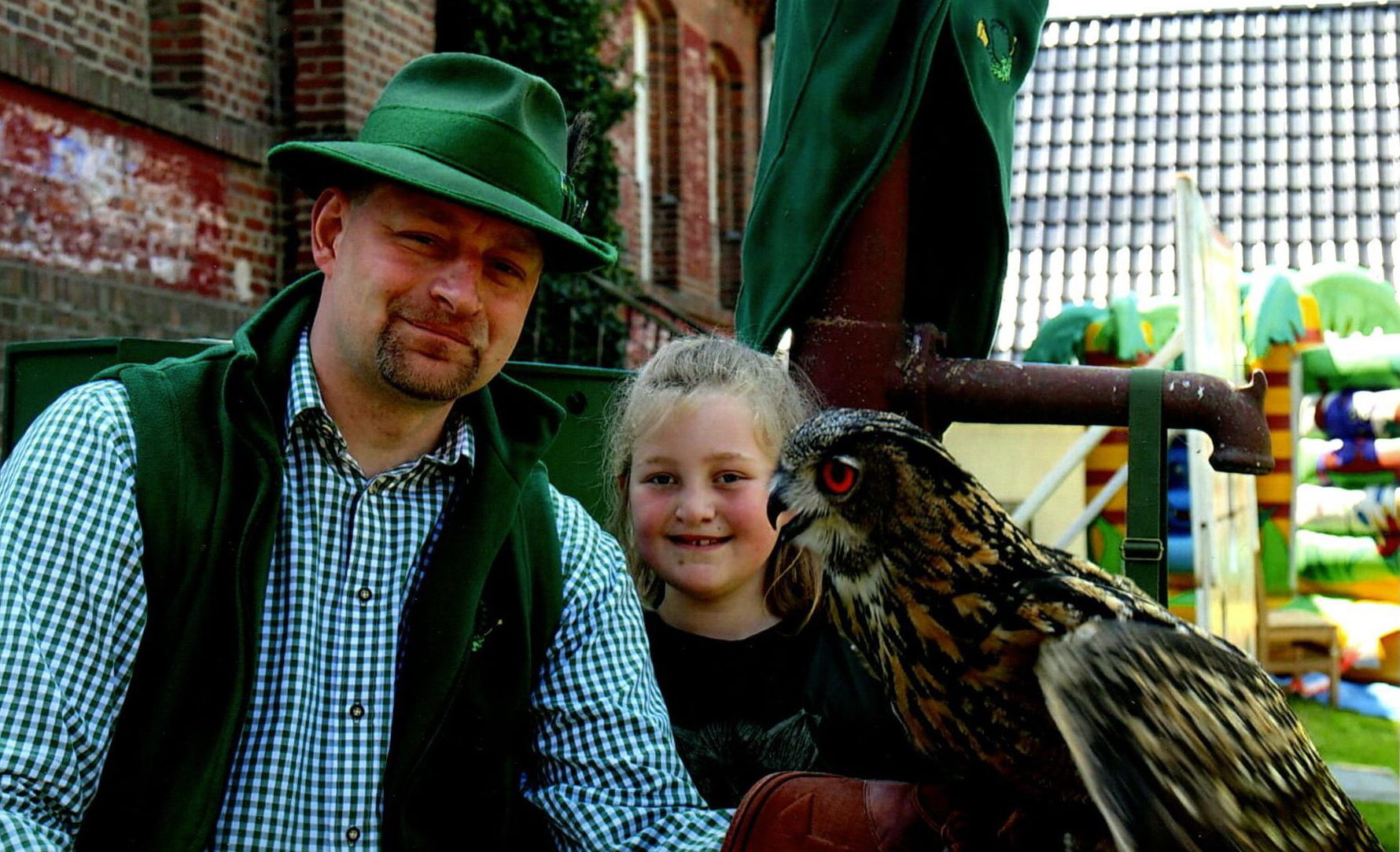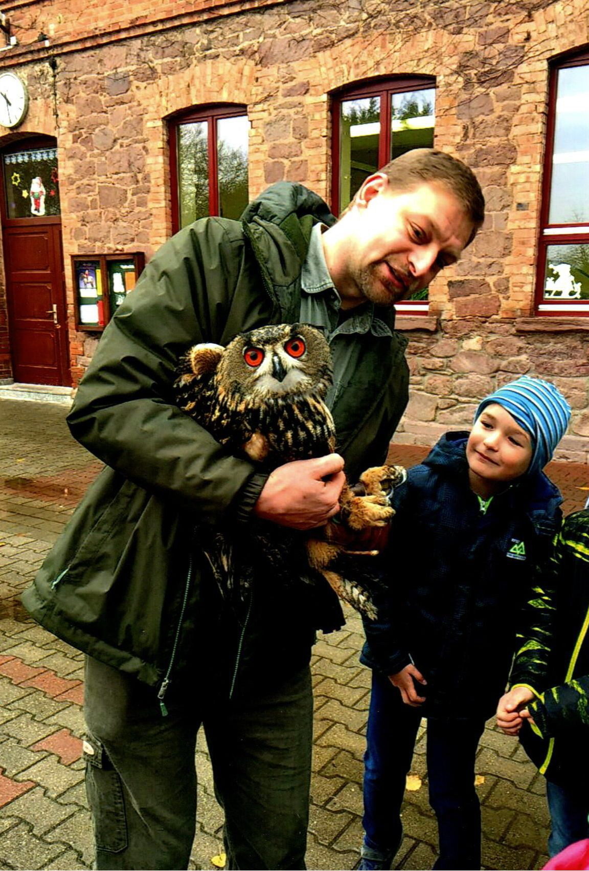 Jedes Jahr wird der Baum des Jahres in dem Areal gepflanzt und immer wieder etwas Neues gebaut. Dazu hat Michael Rückrieme über den Freundes- und Bekanntenkreis, aus Jägernachlässen, aber auch über Ebay Tierpräparate und Trophäen angeschafft. Bis dahin war das Waldmobil des Landesjagdverbandes Dauergast. Natürlich gehören bis heute auch Themen-Ausflüge ins Umland, Exkursionen und Revierrundgänge zu den Angeboten, die auf dem Plan stehen. Höhepunkt jeder Veranstaltung ist aber seit 2017 Uhu „Paula“. Zu ihr ist Michael Rückrieme auch ein wenig wie die Jungfrau zum Kind gekommen. Nach seiner erfolgreichen Falknerprüfung hatte er ab und zu mal ein paar Pflegegäste, aber nie Ambitionen, auch selbst ein Tier zu halten. Kontakte zu anderen Falknern gab es ausreichend. In den Gesprächen gab es aber keine Abneigung, es irgendwann mal dann doch zu einer „Familienerweiterung“ kommen zu lassen. Die Entscheidung nahm ihn eines Tages ein Züchter aus der Steiermark ab, der ihm per WhatsApp ein Foto von einem Gelege schickte. Darauf zu sehen: Ein mit „Michi“ beschriftetes Ei. Keine Frage, dass Michael Rückrieme dieses Angebot nicht ausschlug. Vier Wochen blieben ihm damals, um alle Vorbereitungen zu treffen. Im Mittelpunkt stand dabei der Bau einer 55 Quadratmeter großen Voliere. Uhu und Rückriemes wurde schnell eins und unzertrennlich. Auch wenn sich „Paula“ im Allgemeinen sehr zutraulich zeigt, hat sie doch auch ihre „Starallüren“. „Ich glaube, sie spürt deutlich, wenn sie im Mittelpunkt steht“, meint der Falkner mit einem verschmitzten Lächeln. Auch Teckel „Hummel“ bekam das schon zu spüren. Eine Attacke von „Paula“ verschreckte den freundlichen Teckel, der seitdem auf der Hut ist, wenn der Uhu in seine Nähe kommt. Letztendlich kommen aber beide klar, wenn sie wieder die tierischen Stars in einer Veranstaltung sind.