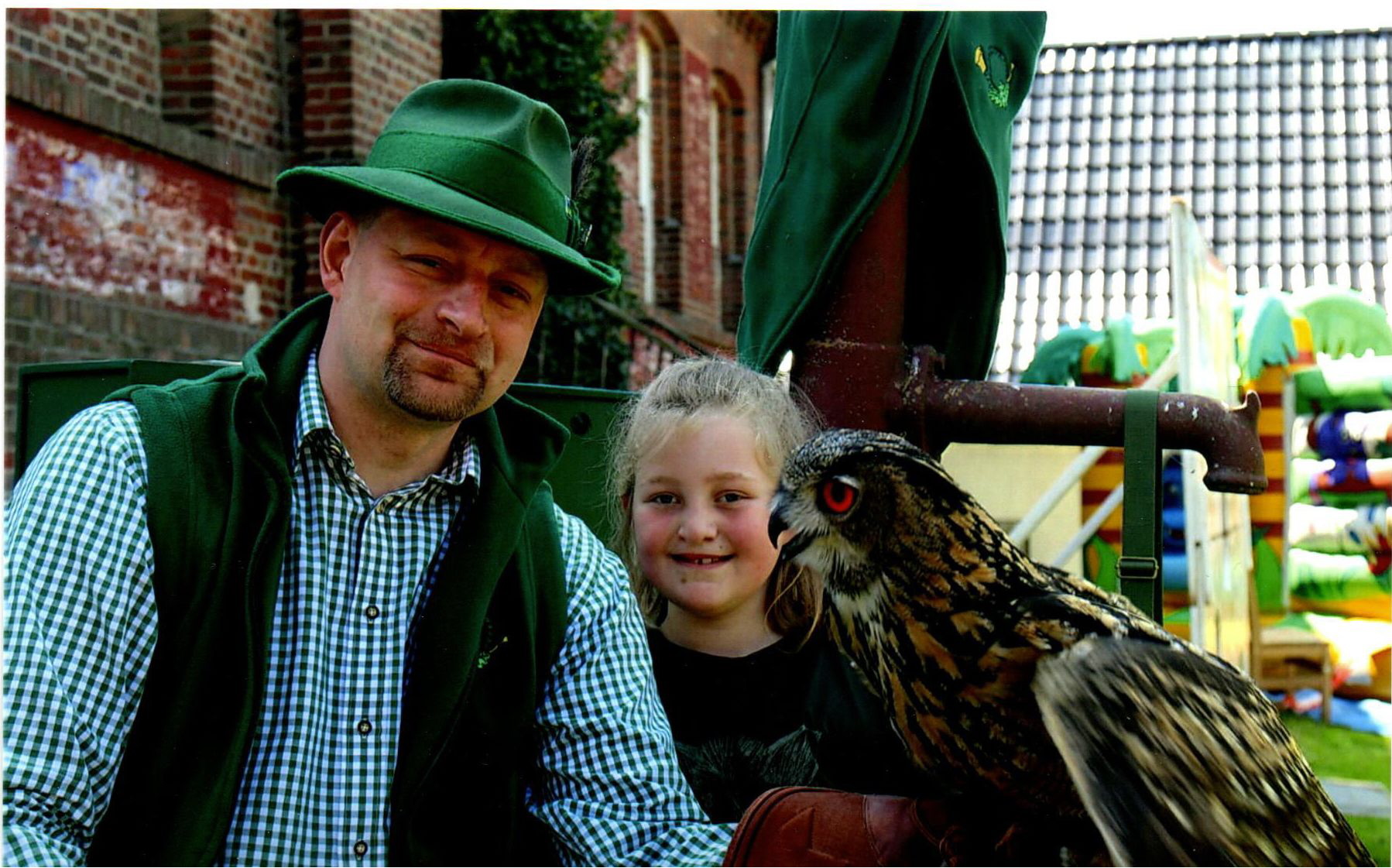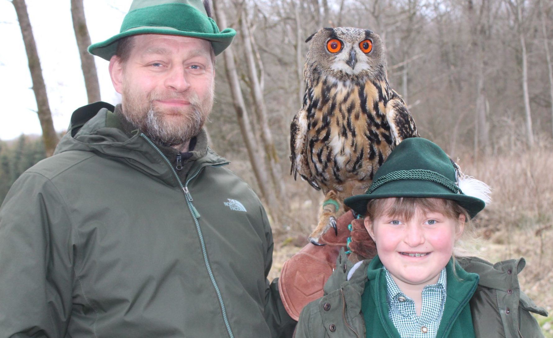 So stand am Anfang ein „Waldfuchsprojekt“ der Schutzgemeinschaft Deutscher Wald. Natürlich in der Kita, die Tochter Klara besuchte. Und das lebenslustige Mädchen trat von Beginn an bewusst in die Fußstapfen ihres „Helden“. Anfänglich als treue Begleiterin bei den Terminen. Doch mit zunehmenden Alter wuchsen dann die Aufgaben – immer auf freiwilliger Basis. Klara übernahm Verantwortung als Hundeführer für Teckel „Hummel“ und konnte den Kita-Knirpsen auch schon einige Dinge erklären. Natürlich wird auch mit angepackt, wenn Präparate oder andere Dinge ein- und ausgeladen und auf- und abgebaut werden müssen. Das Feuer wurde endgültig entfacht, als es gelang ein Turmfalkenjunges, ein Fundtier, aufzupäppeln, welches Rückriemes in Obhut genommen hatten. Nicht mehr zu bremsen ist Klara seit „Paula“ – ein europäischer Uhu – zur Familie gehört. „Andere haben einen Hund oder eine Katze, wir eben ein Uhu. Ich finde das cool und habe auch kein Problem damit, zu erklären, was es mit dem Vogel auf sich hat“, ist Klara stolz auf ihr ungewöhnliches Hobby. Mittlerweile gehört dazu auch das Jagdhornblasen oder die Revierarbeiten – im Prinzip alles, was auch Vater Michael hinter dem warmen Ofen hervorlockt. Und auch der Berufswunsch ist schon einbetoniert: „Ich möchte Förster werden“, kündigt Klara an. (2019)