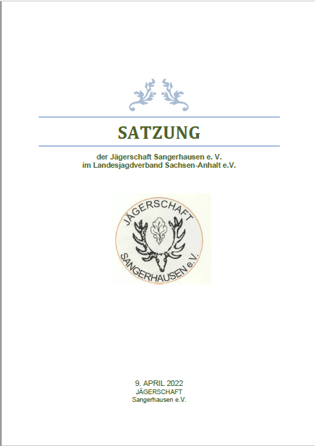 SATZUNG der Jägerschaft Sangerhausen e. V. im Landesjagdverband Sachsen-Anhalt e.V. 9. APRIL 2022 § 1 Name, Sitz 1. Der Verein führt nach Eintragung in das Vereinsregister des Amtsgerichts Stendal den Namen Jägerschaft Sangerhausen e. V. und verfolgt ausschließlich und unmittelbar gemeinnützige Zwecke im Sinne des Abschnitts „Steuerbegünstigte Zwecke“ der Abgabenordnung. […]