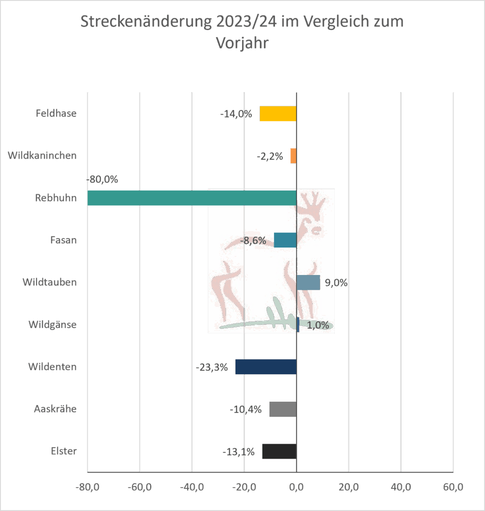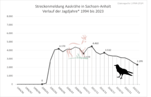 Aus der Differenz der Frühjahrs- und Herbstdichten ergibt sich die Nettozuwachsrate. Dieser Wert gibt einen Aufschluss über die Entwicklung der Population über das Jahr. 2024 lag die Nettozuwachsrate in Sachsen-Anhalt bei + 9,3 %. Ein positiver Wert weist auf eine Zunahme des Bestandes vom Frühling zum Herbst hin. Die positive Entwicklung ist höchstwahrscheinlich auf die guten Bedingungen über das Jahr hinweg zurückzuführen. Durch das warme Frühjahr und den warmen, aber teilweise feuchten Sommer war die Vegetation gut entwickelt und es lagen sehr gute Äsungsbedingungen vor. Zudem ist anzunehmen, dass die witterungsbedingte Sterblichkeit der Junghasen 2024 relativ gering ausgefallen ist. In vielen Teilen gab es zusätzlich noch eine sehr hohe Mäusepopulation, welche als „einfache Beute“ Grund für einen verringerten Prädationsdruck gewesen sein kann.