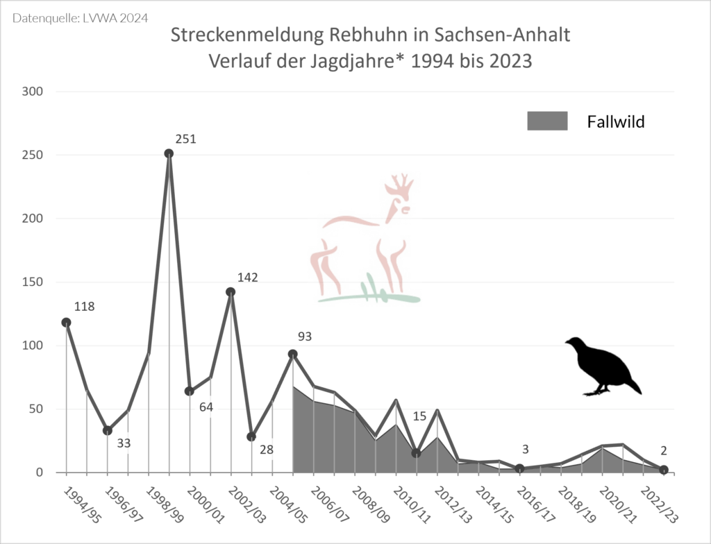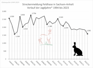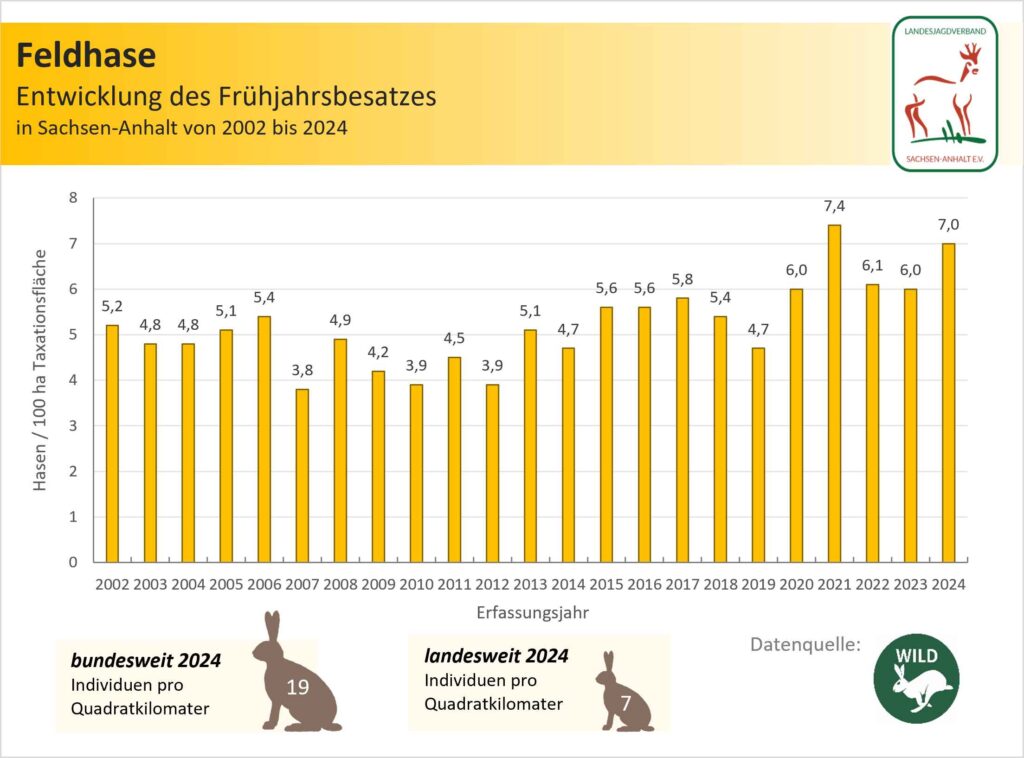 Verglichen mit dem bundesweiten Durchschnitt mit einem Frühjahrsbesatz von 19 Feldhasen pro Quadratkilometer Offenland liegt Sachsen-Anhalt mit seinem Feldhasenbesatz weiter weit zurück.