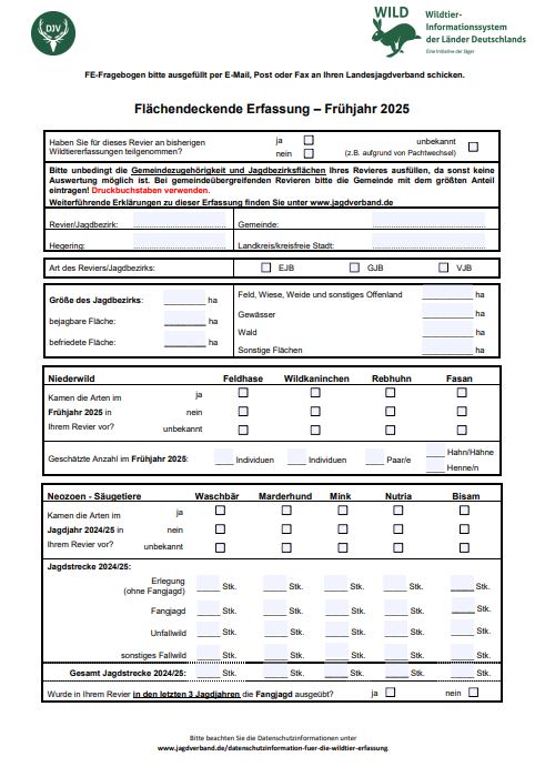 Richten Sie dafür Ihr Revier in der neuen Datenbank ein und füllen Sie nach Bestätigung den Erfassungsbogen online aus. Ein Tutorial für die digitale Eingabe finden Sie links. Bitte nur Reviere registrieren, die bei der UJB erfasst sind. Hegeringe und Pirschbezirke können nicht verarbeitet werden. Bitte nutzen Sie die Möglichkeit zur digitalen Eingabe, Papierbögen werden jedoch auch weiterhin angenommen und ausgewertet. Bei Rückfragen oder Problemen melden Sie sich bitte bei der WILD-Länderbetreuerin.